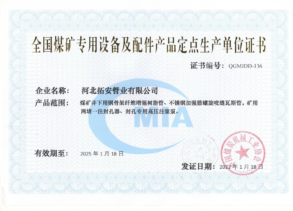全國煤礦專用設(shè)備及配件產(chǎn)品定點生產(chǎn)單位證書