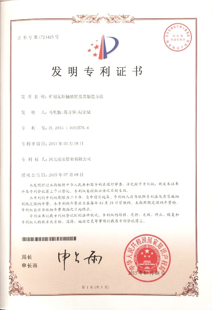 礦用瓦斯抽放管及其制造方法證書