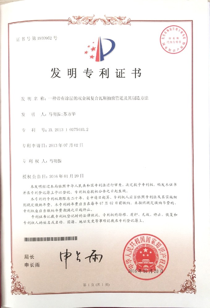 一種帶有涂層的雙金屬復合瓦斯抽放管道及其制造方法證書