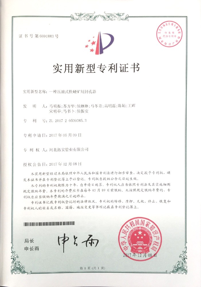 一種壓濾式快硬礦用封孔器證書